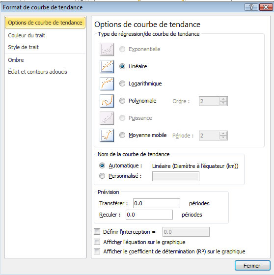 - dans l'onglet Options de courbe de tendance, choisir une régression linéaire puis cliquer sur Fermer