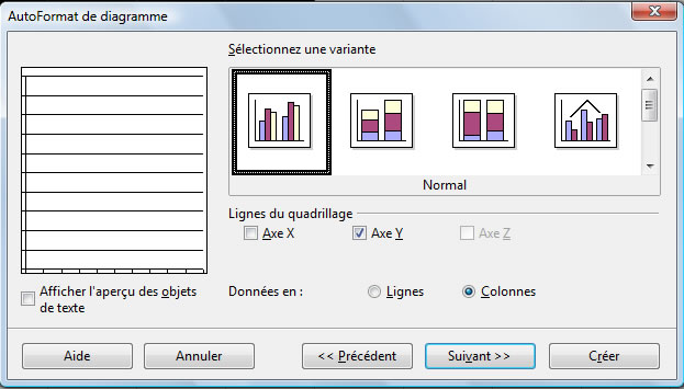 Choisir un type de graphique, indiquer si les données sont en ligne ou en colonne, puis cliquer sur Suivant.